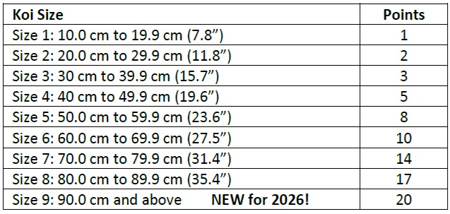 All koi will be measured from tip of the nose to the end of the tail for determining the fish points below. The following table must be used to calculate the number of tanks needed. NOTE: this year our show will have a Size 9 for koi above 90 cm.